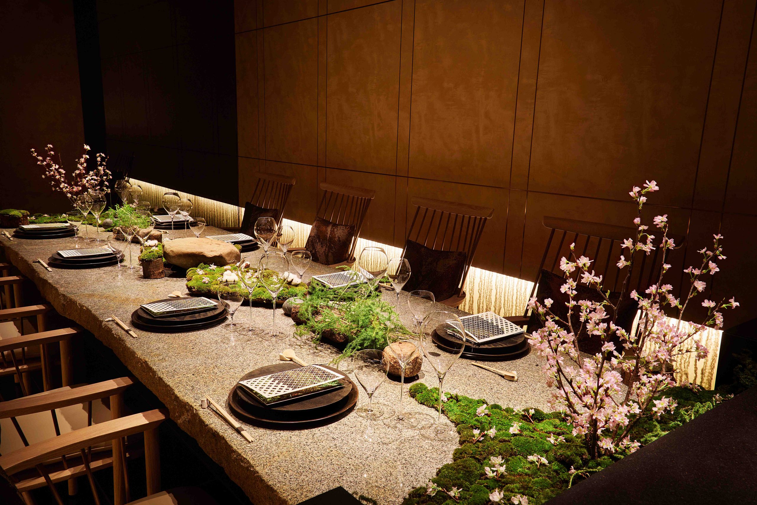 専属の庭師が、庭を手入れするようにテーブルコーディネートを担い、自然の雄大な音色の中で味覚や嗅覚を刺激する食材の味わいを最大限に引き出したお料理で皆様をお迎えする「シェフズ・テーブル by Katsuhito Inoue」は、季節の巡りを感じていただけるよう、桜の装飾で華やかに彩られた、春の訪れを感じさせる優雅な空間に。咲き誇る桜の美しさに加え、京都の「七十二侯」をテーマに旬の食材を調理したお料理から香りや味わい、心地よい春の空気を五感で感じる没入感溢れる特別なひとときをご提供いたします。