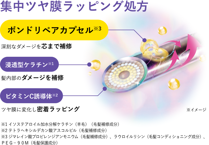 2.浸透型ケラチン*2×ビタミンC誘導体*3の「ツヤ膜ラッピング処方」でなめらかにまとまる髪へ