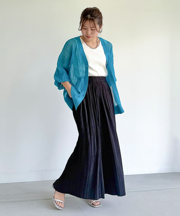 雨の日も安心な撥水機能のプリーツワイドパンツに、シアーニットカーディガンをオン。じめじめした梅雨の期間でも、さらっと快適に過ごせるコーデです。どんよりした曇り空に負けない差し色を選べば、気分も晴れやかになります!