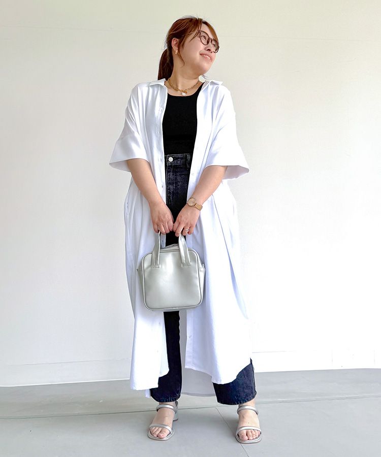 じめっと暑苦しいのか、少し肌寒いのか…気温にも左右される梅雨には、撥水機能のあるシャツワンピースを羽織として着用することで温度調節が可能に。シンプルに見えて、一気にこなれ感が出るコーデにしました。