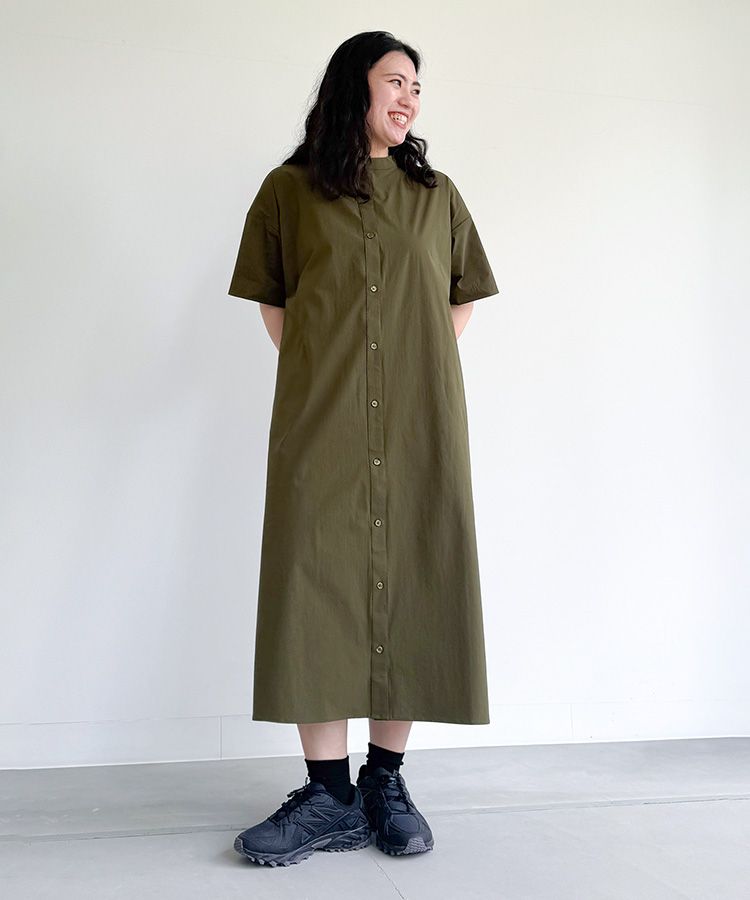 コーデを考える必要のない、一枚で決まるオシャレなシャツワンピースコーデ。防汚・防水機能付きで梅雨に一枚は持っておきたいアイテムです。