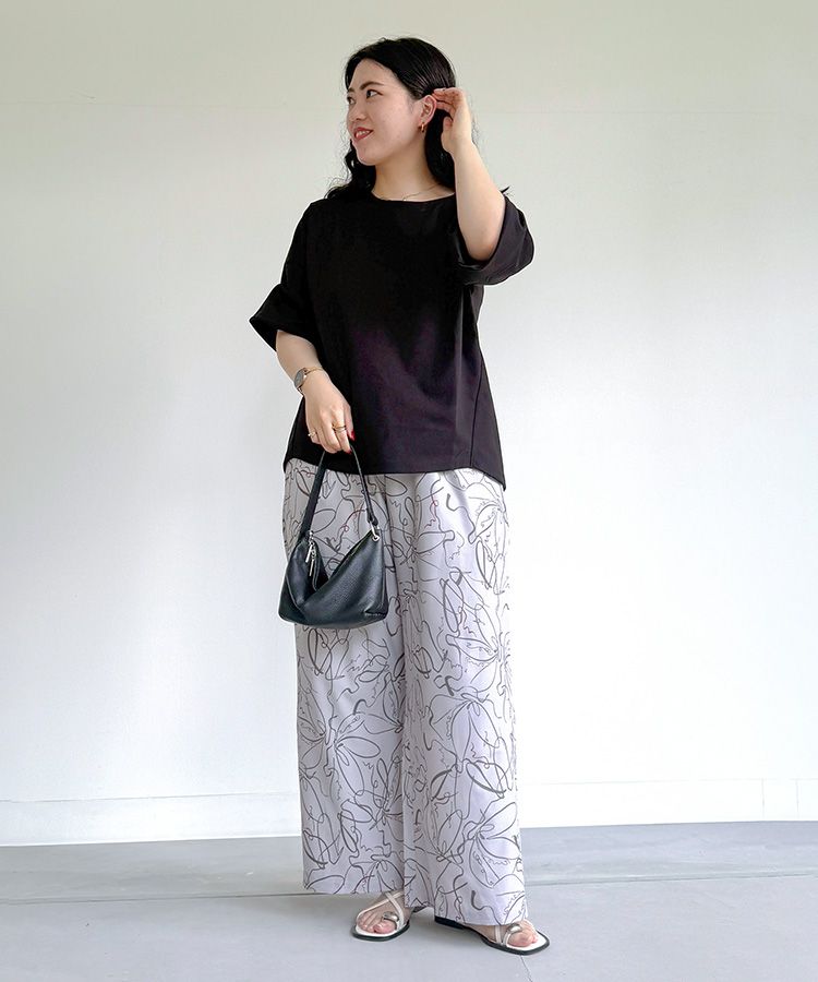 柄のパンツに合わせることで、大人カジュアルなコーデにしました。袖にタックが付いていることで、シンプルながらもデザイン性のあるシルエット×柄の相性はバツグンです。