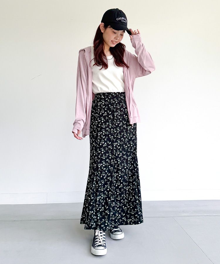 吸水速乾のUVパーカーに小花柄のマーメイドスカートを合わせることで、アクティブさもありつつ、女性らしい落ち着いた印象のコーデに。梅雨時期の温度調節もしやすく、見た目にも華やかな印象に仕立てています。