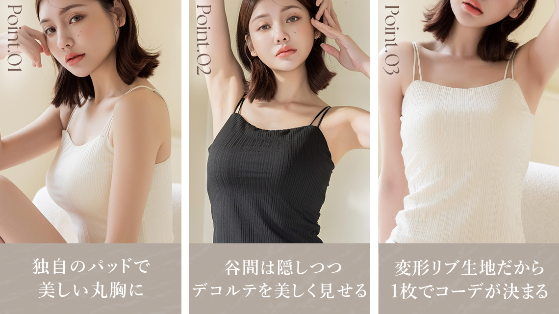 1枚切るだけでコーデが決まるアイテムですが、バストを美しく魅せるこだわりの設計で、横から見ても美しい上向きの丸胸バストをキープ。「盛れない」「ズレる」など、ブラトップを着た時の“よくあるお悩み”を気にせずにファッションを楽しむことができます。