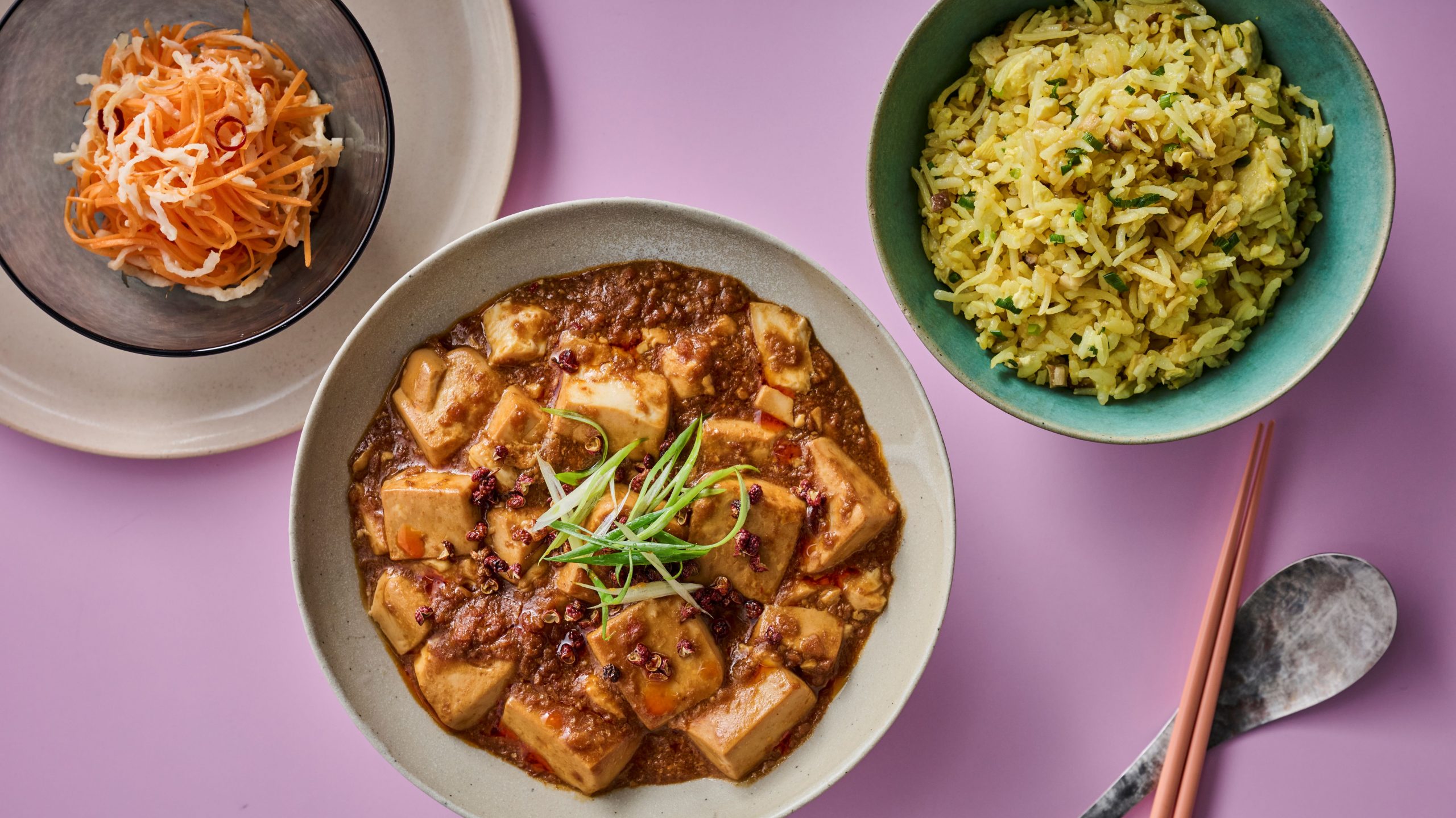 ヴィーガンには見えない、驚きの中華レシピ。麻婆豆腐は大豆ミートを使い花椒を聴かせて本格的な味わいに。卵なしで美味しく仕上げられる炒飯とさっぱりとした副菜も作ります。