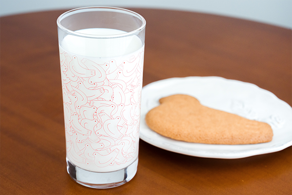 たくさんの鳩サブレーたちがぎゅっと集まった柄のグラス「不思議グラス つめたくしてね」には、冷たい飲み物を注ぐと真っ白な鳩たちが色づく、不思議な仕掛けが施されています。