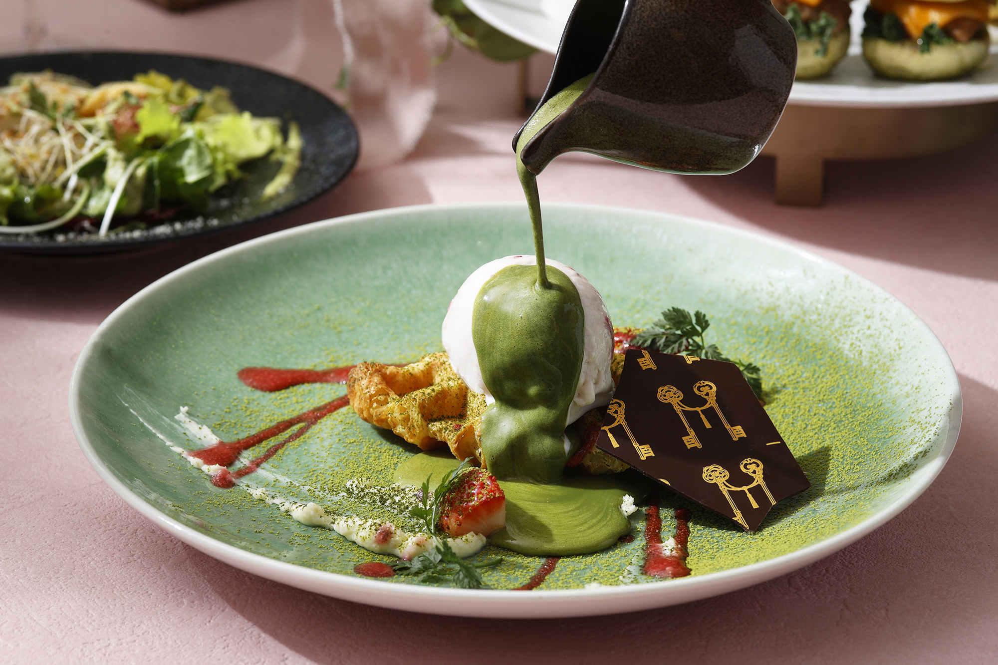 サクサクのクロッフルに爽やかなライムクリームチーズと、いちごとマスカルポーネのアイスクリームを添え、仕上げに濃厚な抹茶ホワイトチョコレートソースをかけてお楽しみいただけます。